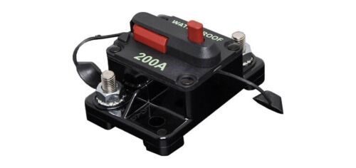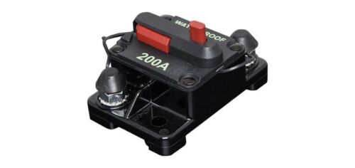 This 200A high current surface mount circuit breaker is ideal for use in 12V or 24V DC power systems. It features a IP67 weatherproof casing with M6 terminal bolts for connection to power cabling. The breaker can be easily reset using the red lever switch. Typically used in auxiliary and accessory circuits in automotive and marine applications. Also suitable for battery charger designs. Tested to SAE J1625 & SAE J1171 (ignition protected).