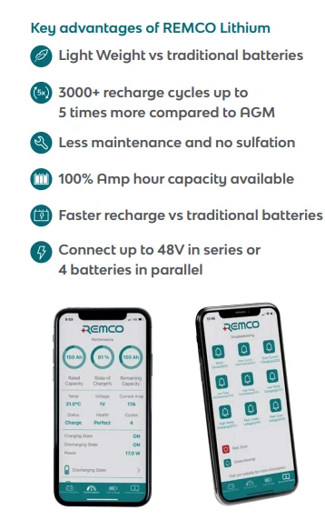 - It includes the Remco Lithium app, which allows you to monitor the battery’s health, status, and performance via Bluetooth connectivity.