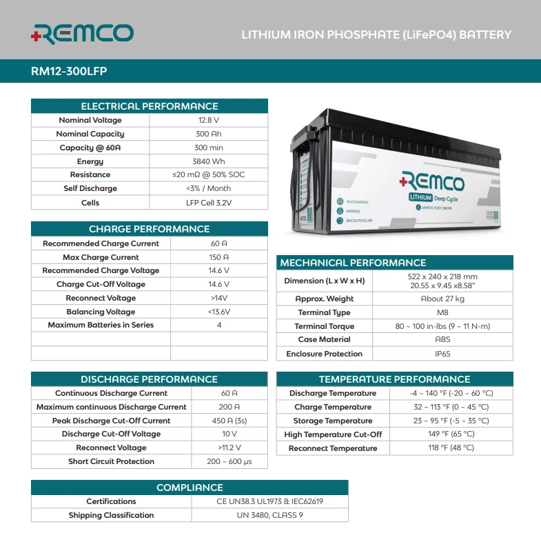 The Remco RM12-300LFP is a lithium deep-cycle battery that offers superior performance and durability for various applications. It has the following features: