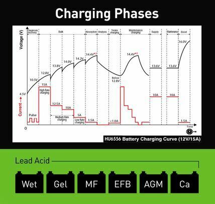 - Charges all battery types including Lead Acid, GEL, MF, EFB, AGM and Calcium