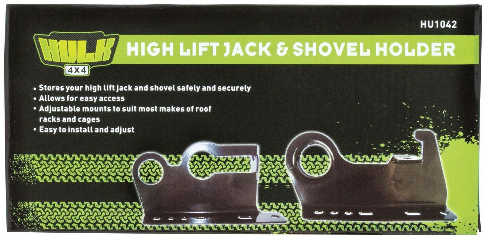 Stores your high lift jack and shovel safely and securely. Adjustable mounts to suit most makes and models of roof racks & cages. Allows for easy access and safe storage of your high lift jack and shovel.