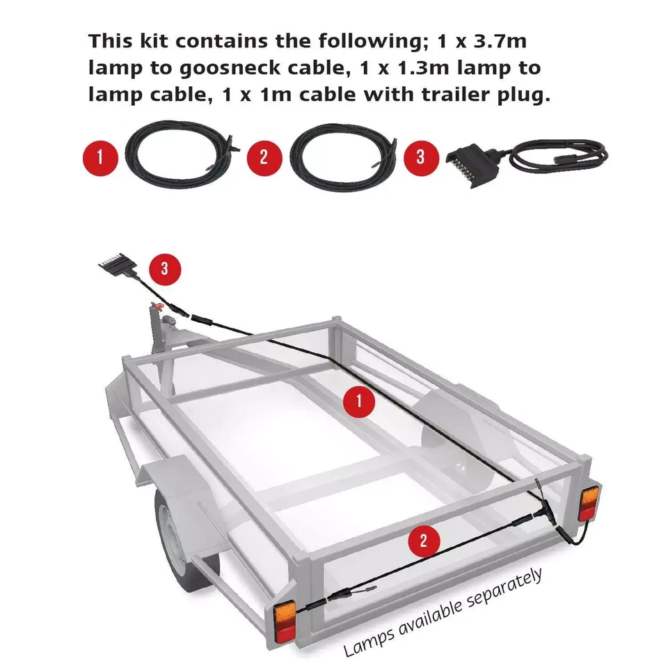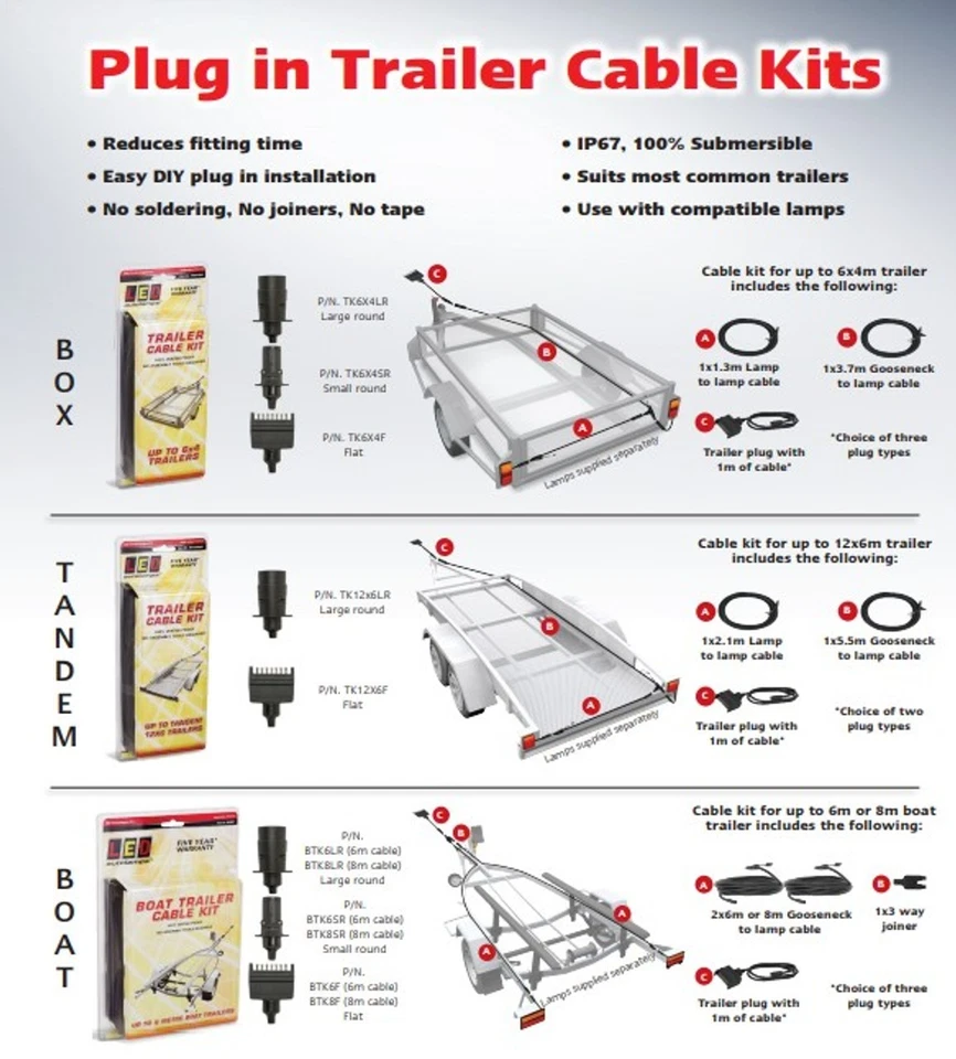 6×4 plug in trailer harness kit, compatible with LED autolamps 150BAR2 and the 100BAR2, kit contains 5C370C gooseneck to lamp 3.7m cable, 4C130C lamp to lamp 1.3m cable and 5C41 flat trailer plug with 1m cable, IP67 ingress protection rating, 100% fully submersible,sold in retail blister pack