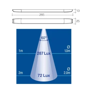 Dual colour with white and amber L.E.Ds attracts fewer insects. Suitable for exterior or interior applications, slim design – 13mm thick. Ultra reliable, fully sealed (IP66) and sea/salt spray resistant easy touch button switch to change between colors.